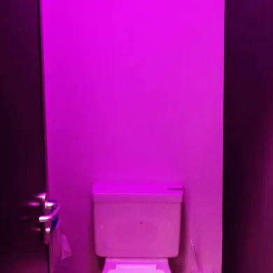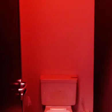 Jede WC-Kabine wird abwechselnd mit reinem Rot-, Gelb- und Blaulicht beleuchtet. An den Wänden befinden sich Bilder, die jeweils nur bei einer bestimmten Farbe zu sehen sind.