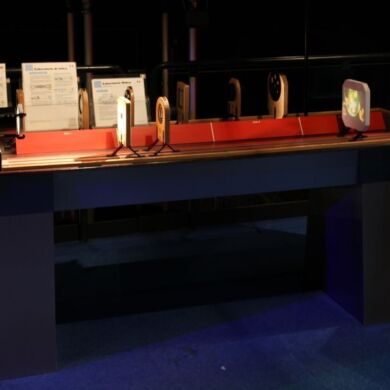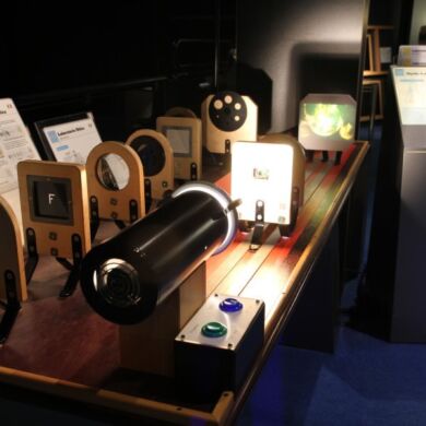 Zu sagen, dass man hier einen Diaprojektor zusammenbauen könne, würde der Vielfalt an Experimentier-Reichtum dieses Exponates nicht gerecht werden. Was passiert, wenn man Linsen kurzer, mittlerer oder hoher Brennweite verwendet oder gar kombiniert? Warum sieht man immer noch das ganze Bild auf dem Projektionsschirm, wenn man einen Finger vor die Linse hält, nicht aber wenn man einen Finger vor das Dia hält? Diese und noch viel mehr Fragen beantworten sich von selbst beim Optik-Labor!