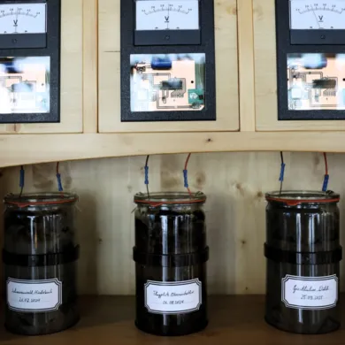 In acht Einmachgläsern voller Schlamm leben Bakterien, die Strom erzeugen. Eine komplizierte Elektronik nutzt den Strom, um Radiosignale an ein Radio zu schicken. So hören wir die Lebenszeichen der Bakterien als Zwitschern aus dem Vogelhaus.