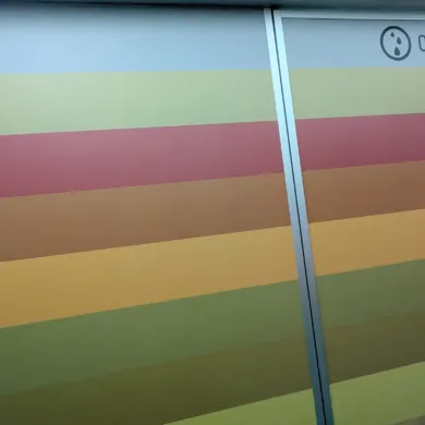 In the restroom, the walls are painted with shades representing various foods (IN) and the corresponding colors of feces (OUT2) and urine (OUT1). These colors were created by the Development and Didactics team.