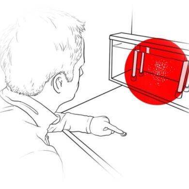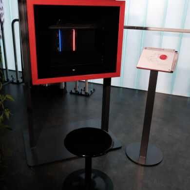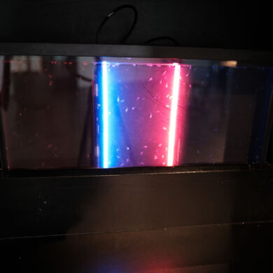 Salzkrebse folgen dem Licht und damit ihrer Nahrung. Über einen Knopf am Exponat wechselt der Betrachter die Farben zwischen zwei Lichtquellen, worauf sich die Salzkrebse im Aquarium auf die Reise machen.