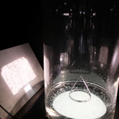Slowly pull a metal ring out of the water: you can see how the surface tension tries to hold it back. The strength of this force becomes clearly tangible.